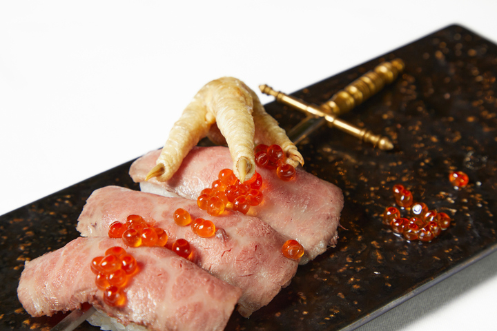 マイエルが狩ったアレを巻いたゼメキス家 の⾁寿司(和⽜)。